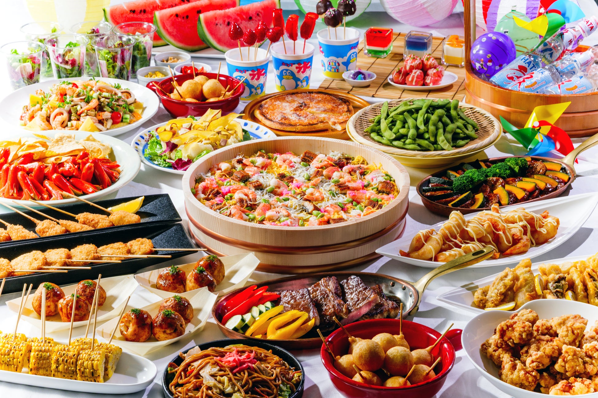 〈料理〉キハダマグロのタタキ/野菜とトマトの冷製ガスパチョ/アボカドとシーフードのハワイアンサラダ/カップシェイクサラダ 各種ドレッシング添え/鶏ハムのサラダ/ちらし寿し/枝豆/焼きとうもろこし/串カツ/海老マヨチリソース/イカのフリット/チーズと蜂蜜のピザパイ/タコさんソーセージとトルティーヤ サルサソース/チーズドッグ/ミニハンバーグ/大野醬油の唐揚げ/夏野菜カレーとガーリックライス/タコ焼き舟盛/焼きそば/牛ロースステーキ(ライブキッチン)