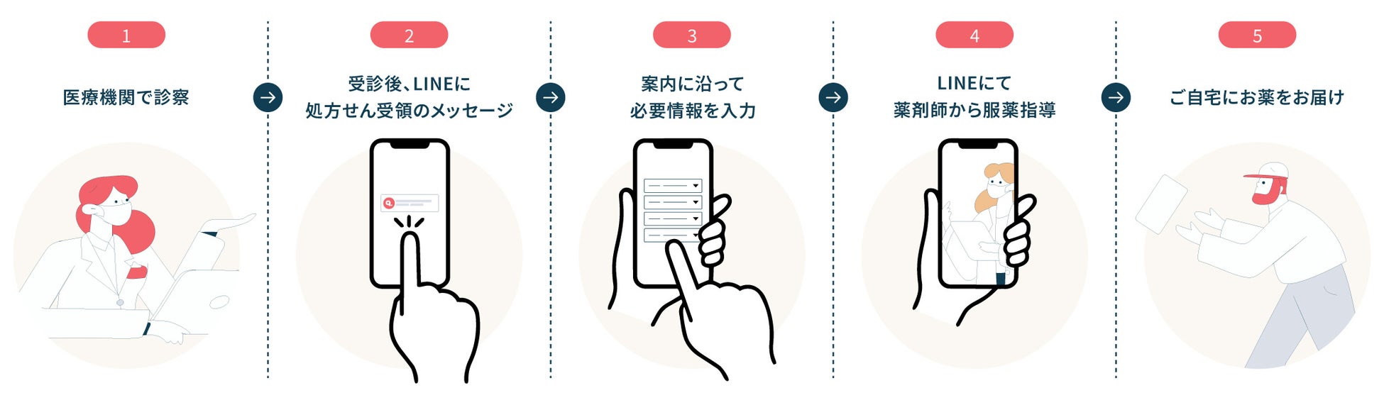 キビヤックの対応医療機関で受診後、処方せんが医療機関からキビヤックファーマシーへ連携されます。患者さまへLINE通知*2 のうえ、薬剤師によるオンライン服薬指導を実施します。服薬指導完了後、「ハコベル」を通じて処方薬を最短当日中にお届けします。