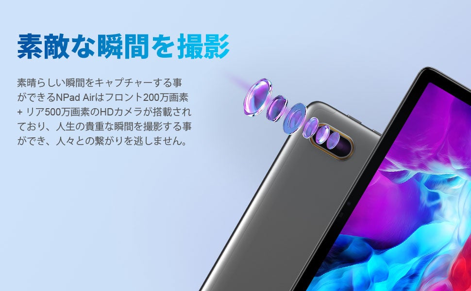 【高性能CPU+10インチ FHD】NPad Airの UNISOC T310は、TSMCの12nmプロセスで製造され、DynamIQアーキテクチャを使用して、パフォーマンスと消費電力を考慮したチップフレームワークを実現し、3つの高効率「A55」コアと複数のCPUコアが連携して動作します。また、学習、エンターテインメント、仕事の効率を大幅に向上させる超省電力機能を備えています。Antutuのランニングスコアは16w点と高く、9863aに比べて性能向上率が高い.10.1インチの1920x1200の解像度を搭載し、ディスプレイはより繊細で滑らかで、視覚効果が優れています