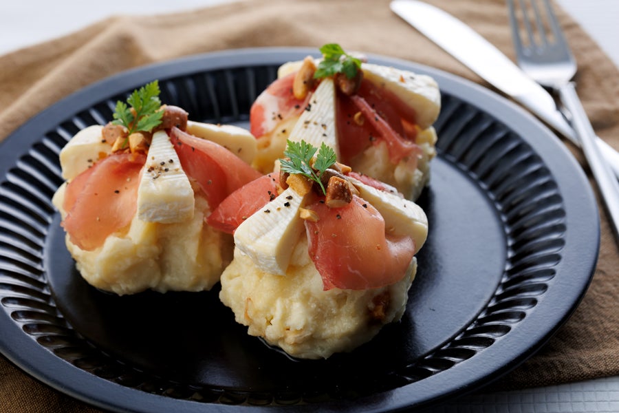 カマンベールチーズと生ハムを贅沢に使った大人のポテトサラダです。カマンベールチーズと生ハムの塩味、はちみつの甘味がワインによく合います。