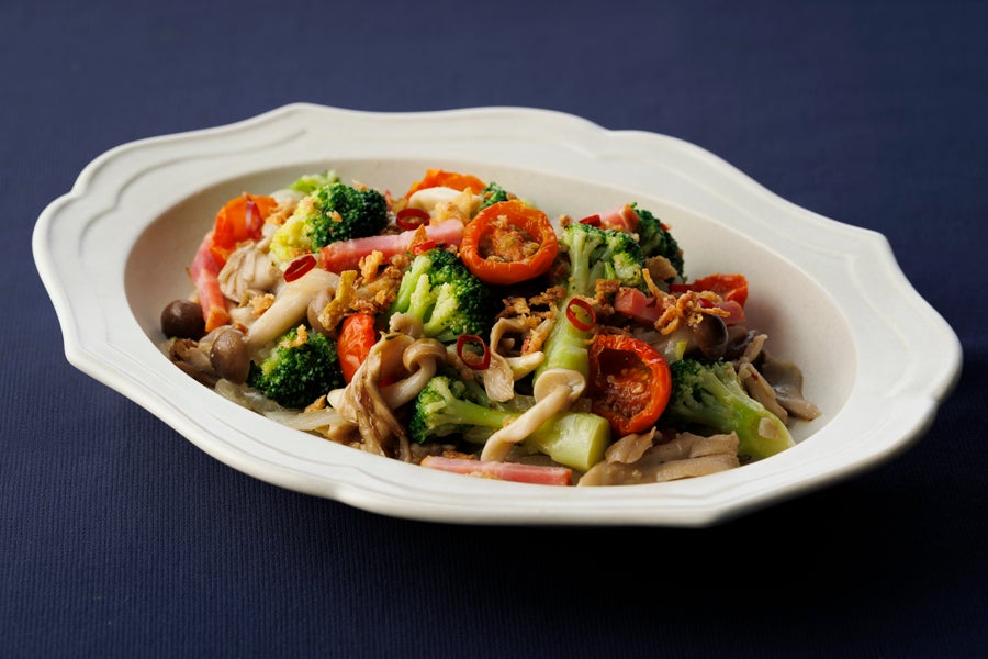 『ハーブ香る 焼ききのことブロッコリーのガーリックマリネ』は、香ばしくグリルしたしめじとまいたけを野菜やベーコンと一緒に、ガーリックのきいたオイルベースのソースで仕上げたデリサラダです。サラダカフェで人気を集めている秋冬向けのサラダをベースに、セミドライトマトを加え、タイムやセージなどのハーブをミックスさせた“エルブ・ド・プロヴァンス”でより香り高く味付けし、ワインに合うようにアレンジしました。そのままはもちろん、温めても美味しくお召し上がりいただけます。