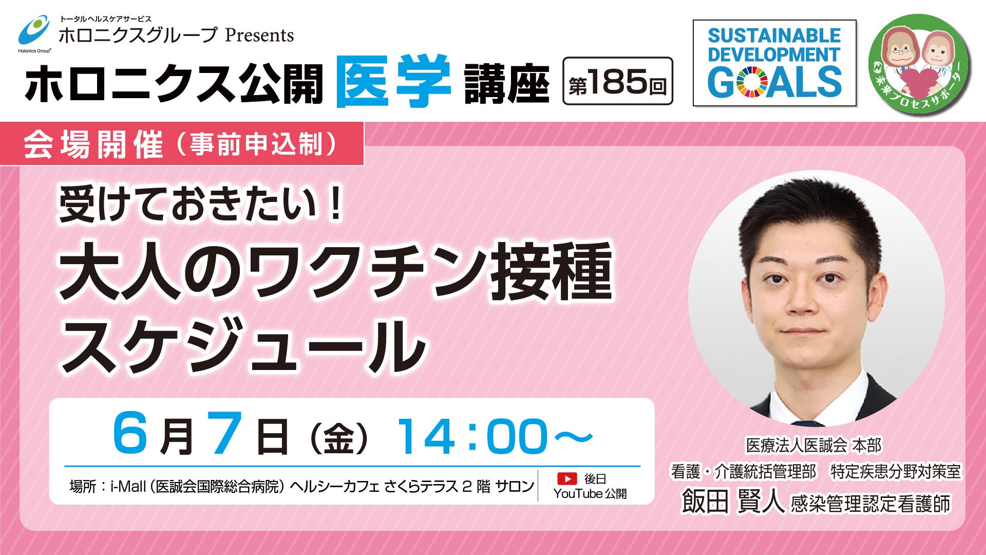 医療法人医誠会(大阪府大阪市 代表者:谷 幸治)では、第185回ホロニクス公開医学講座 『受けておきたい!大人のワクチン接種スケジュール』を大阪市北区南扇町にあるi-Mall内ヘルシーカフェ「さくらテラス 2階サロン」にて2024年6月7日(金)に開催いたします。