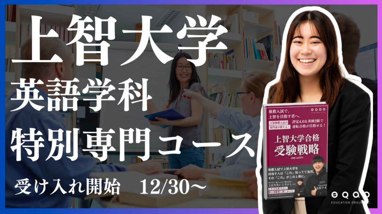 この度、EQAOでは上智大学外国語学部英語学科の特別専門コースの受け入れを1月15日から開始いたします。上智大学で最も人気の高い外国語学部英語学科!上智専門塾のEQAOが受験生を全力でサポートします!