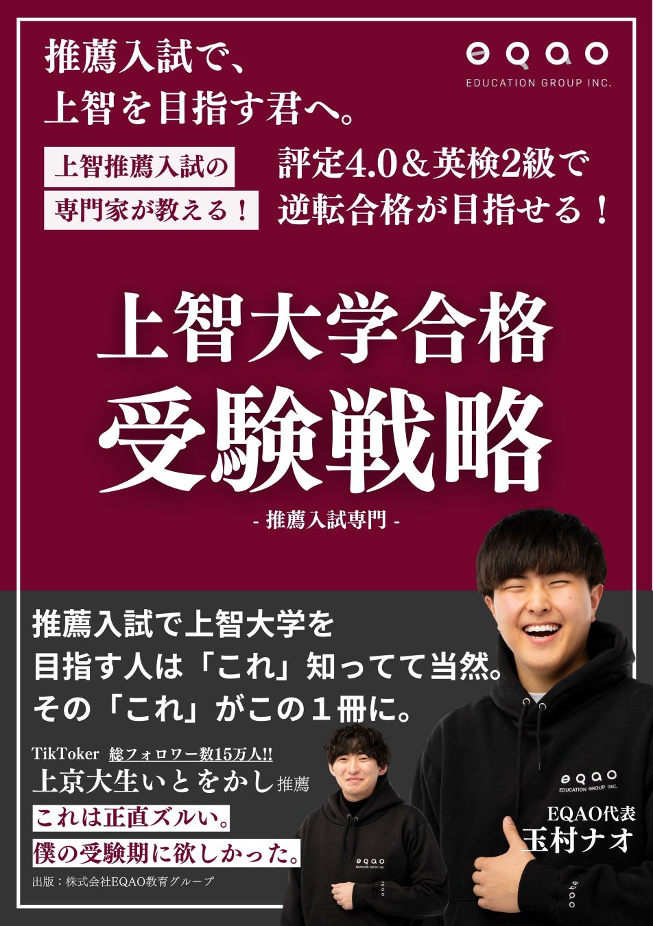 総合型選抜専門塾EQAO上智大学外国語学部英語学科特別専門コース1/15〜受け入れ開始!公募推薦で上智大学英語学科に行きたいならEQAOで対策!現役上智大生8割のEQAOの合格実績は業界トップクラス!