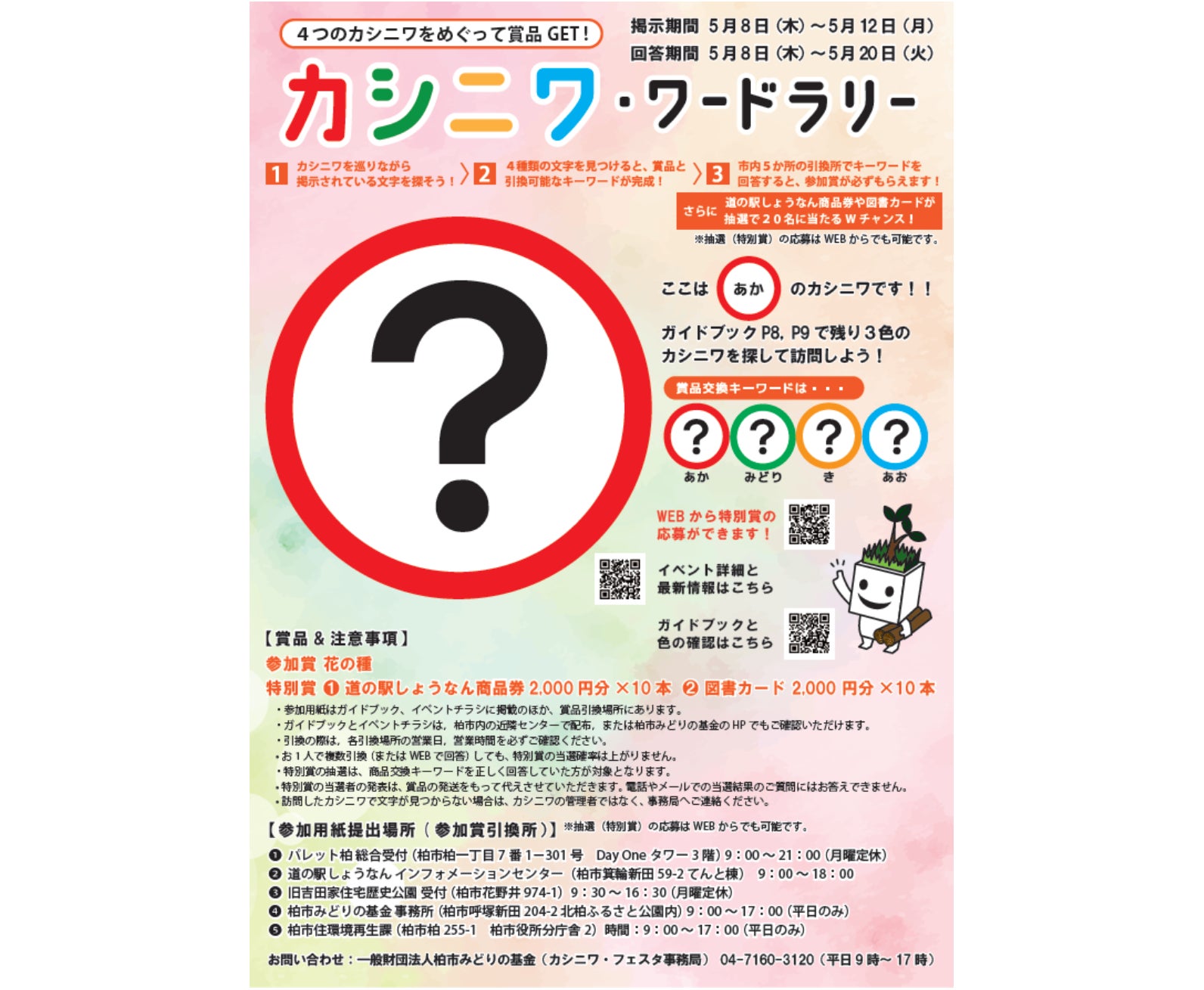 フェスタ期間中は、各カシニワに4種類の文字を1文字ずつ掲示します。フェスタ来場者は、カシニワを巡って4文字のキーワードを完成させると、商品引換所で参加賞と引き換えができます。さらに、参加賞を引き換えた方の中から後日抽選で特別賞を送付します。