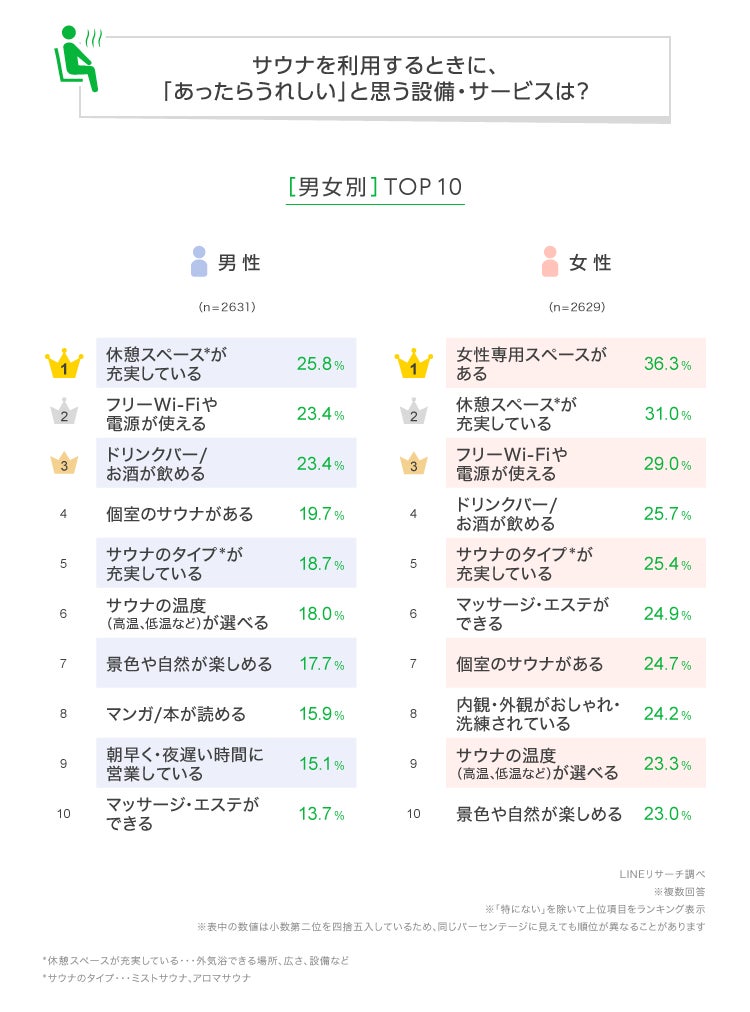 【LINEリサーチ】サウナにあったらうれしいサービスは「休憩スペースが充実している」「フリーWi-Fiや電源が使える」が男女ともにランクイン