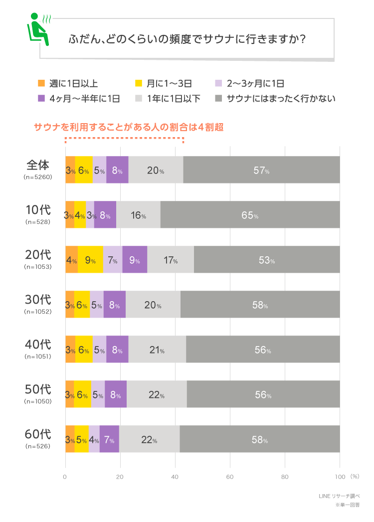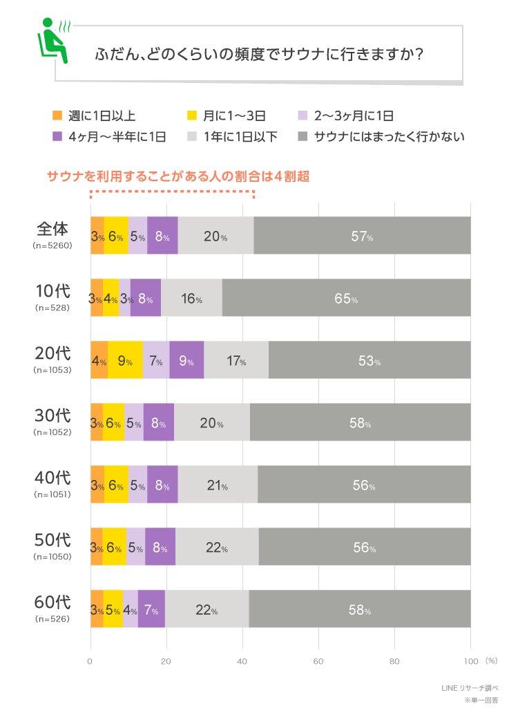 このたびLINEリサーチでは、全国の10代~60代の男女を対象に、サウナに行く頻度や、サウナを利用するときに「あったらうれしい」と思う設備・サービスについて調査しましたので、その結果をお知らせします。