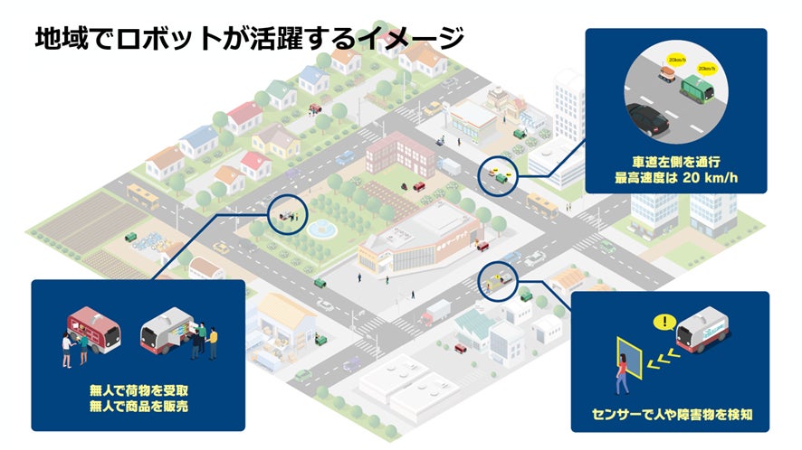 低速・小型ロボットよりも、速度と大きさが増すことにより、最大積載量や稼働率の向上、1件あたりの配送時間の短縮などが可能となります。そのため、宅配便などの多頻度小口配送、無人移動店舗としての商品販売、クイックコマースの配送地域拡大など、現在よりも活躍の幅が広がることが期待されます。