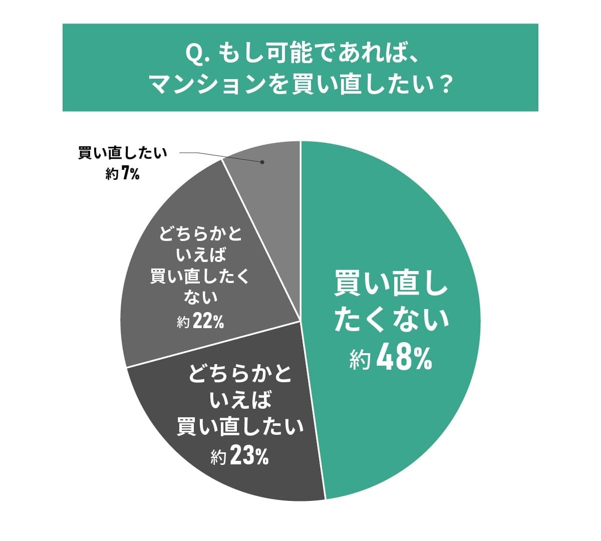 中古マンション購入者に対して、可能であればマンションを買い直したいかどうかを質問しました。現在の住まいへの満足度と、住み替え意向を把握することが目的です。以下が回答結果です。