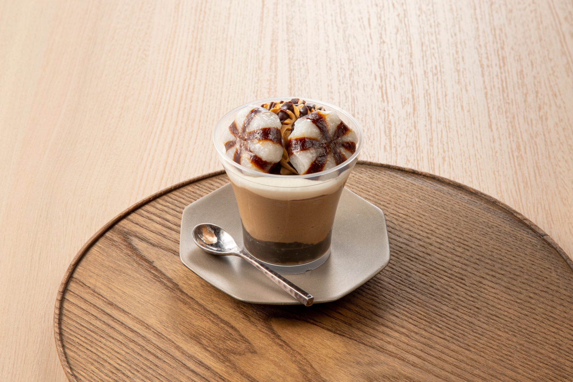 小樽を中心とした郷土菓子であるべこ餅と、ほうじ茶を使ったゼリーやムースと、相性の良いチョコを組み合わせたパフェです。