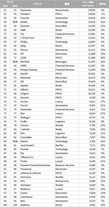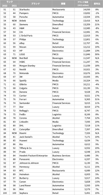 Airbnb(54位、134億ドル)、Red Bull(64 位、115億ドル)、Xiaomi(84位、73億ドル)が初めてランクインし、John Deere、Zoom、Uberがランク外となりました。また、日本ブランドが7(Toyota、Honda、Sony、Nissan、Nintendo、Panasonic、Canon)、韓国ブランドが3(Samsung、Hyundai、Kia)、中国ブランドが2(Xiaomi 、Huawei)となり、アジアブランドとしてこれまでの最多となる12のブランドがランクインしました。