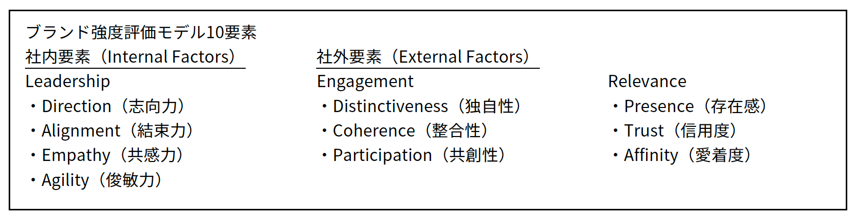・Direction(志向力):ブランドの目指す姿と、それをどのように実現していくかが明確であり、それを実行に導く文化と価値観が定義されているか