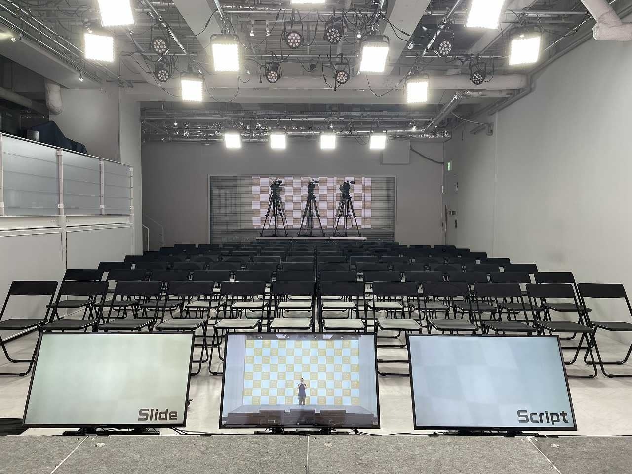来訪観覧最大90名まで対応可。ZOOMやYoutubeライブ、Xライブ(旧Twitterライブ)、VIMEOなどへのライブ配信と会場スタジオ&テクニカルパッケージ。