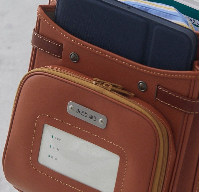 背裏と開閉部分に各ブランドネームの刻印を入れ、GLRのブランドアイコンをモチーフにしたオリジナルの時間割とお名前カードをセットにしました。