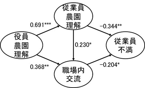 本研究は「わーくはぴねす農園」の利用企業へのアンケート調査を実施し、「利用企業の役員の農園理解」、「従業員の農園理解」「職場内交流」「従業員不満の逓減」などについて127社が回答。この結果を「共分散構造分析*」という手法を使い、相互の関係性の強弱を分析しました。主な分析結果は以下の通りです。