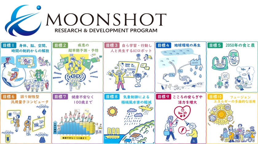 ムーンショット型研究開発制度は、人が身体、脳、空間、時間の制約から解放された社会の実現など、2040年または2050年の未来社会のビジョンを描く挑戦的な国家プロジェクトです。