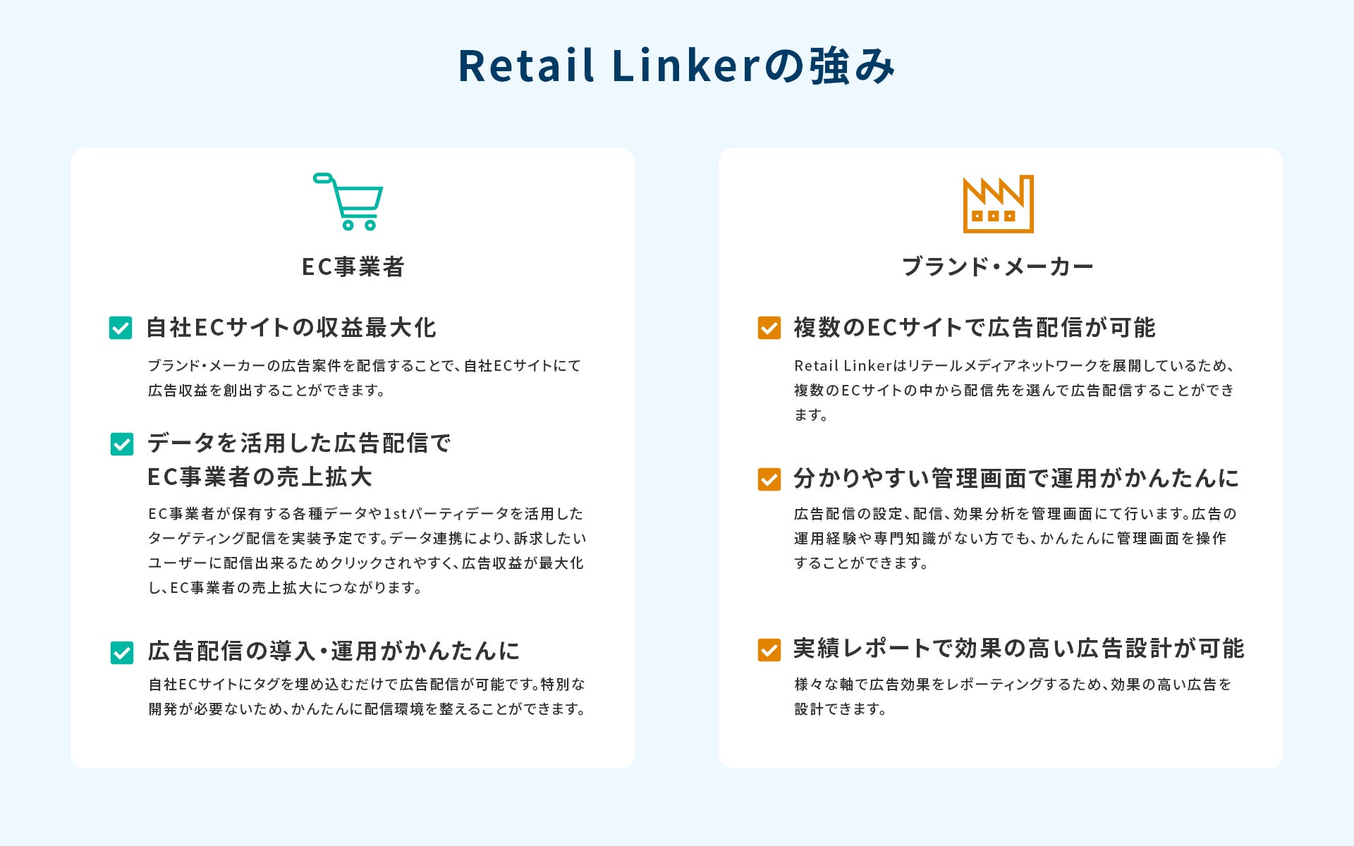 Retail Linkerは、ブランド・メーカーが広告主となり、小売りがもつメディアの広告掲載枠に、リテールメディアネットワークを用いて広告配信を行うサービスです。