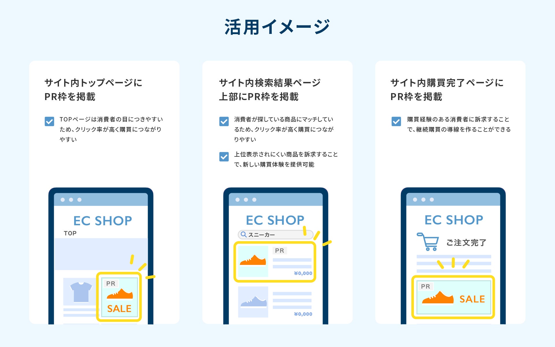 PR広告は、訴求したい商品に広告枠を設置し配信します。今後、カテゴリーや購入履歴、一緒に購入される商品など、ECサイトがもつデータを活用した広告配信を行う予定です。