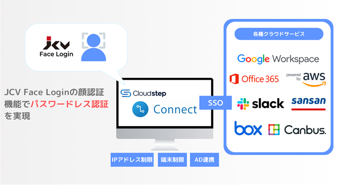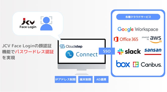 クラウド型認証サービスの「Cloudstep Connect」がパスワードレス認証に対応。顔認証ログインサービス「JCV Face Login」との連携を開始。