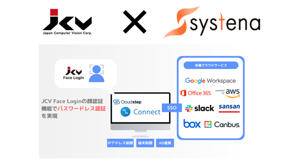 このような背景から、システナが提供するGoogle Workspaceアドオンツールである「Cloudstep Connect」は、今まで提供していた「IPアドレス制限」「端末制限」機能に追加して、JCVが提供する「JCV Face Login」とのSAML連携を実現することで、パスワードレス認証に対応いたしました。