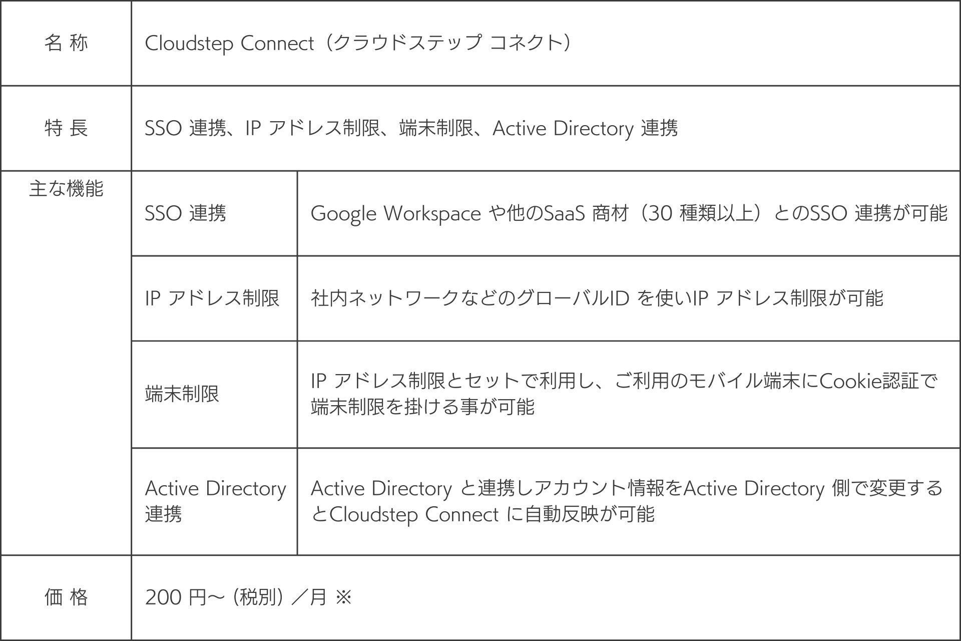 「Cloudstep Connect」は、システナが自社商材として提供するGoogle Workspace のアドオンツール群「Cloudstep シリーズ」の1 つで、SSO 連携やIP アドレス制限、端末制限などの機能を持った認証サービスです。SSO に関しては現在30 社以上の他社SaaS 製品との連携が可能です。Cloudstep シリーズは「Cloudstep Connect」以外に「Portal」「Share(掲示板)」「Calendar」「AddressBook」「Safety for Gmail(誤送信対策ツール)」を提供しておりGoogle Workspace の利活用およびセキュリティの強化を支援しています。