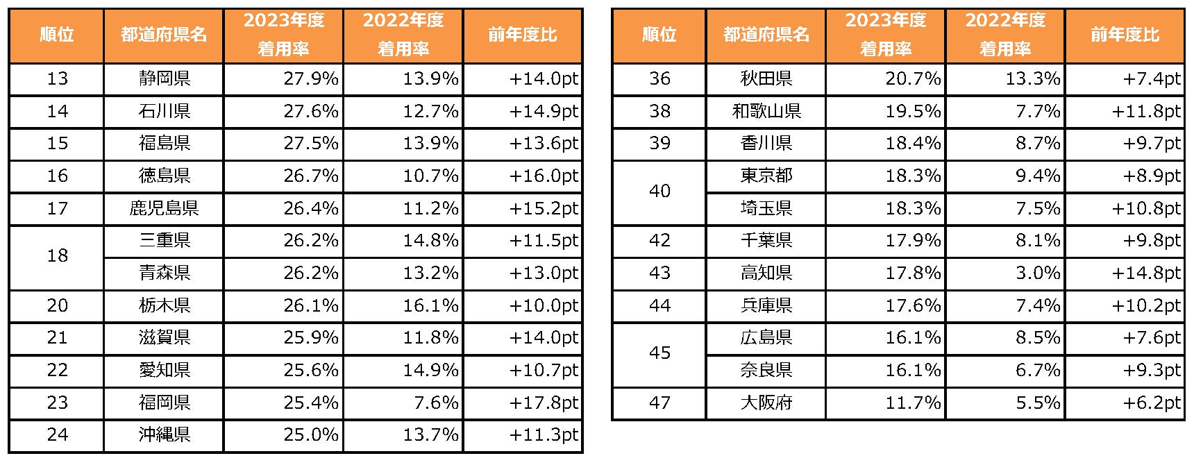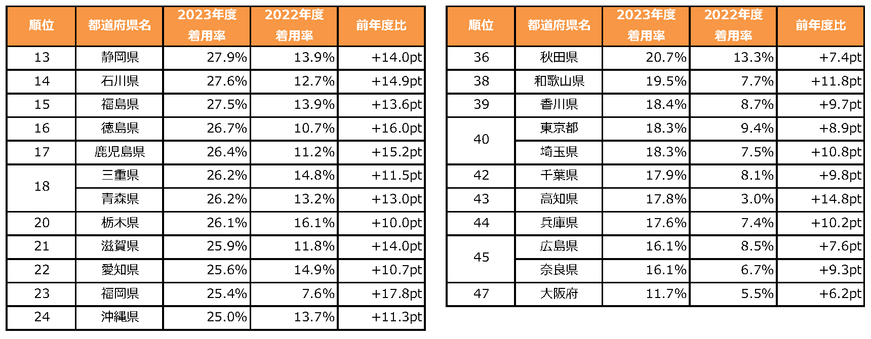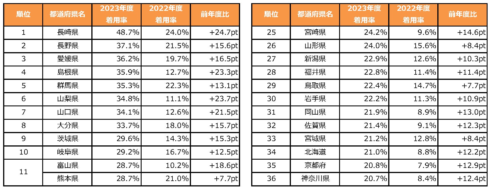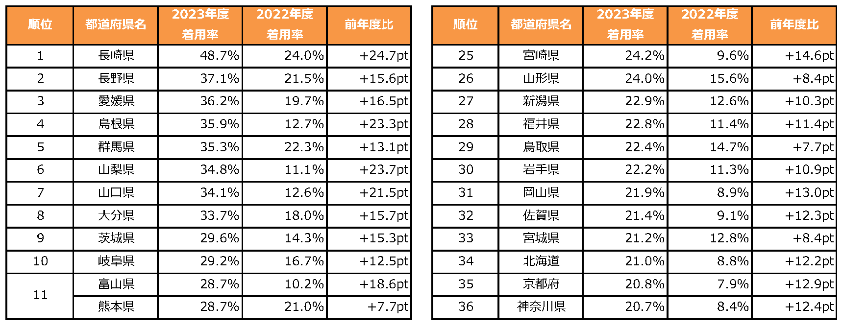 都道府県別の着用率では長崎県が48.7%(前年度比+24.7pt)でトップ、続いて長野県の37.1%(同+15.6pt)でした。なお、長崎県は前年度からの着用率アップも全国トップでした。