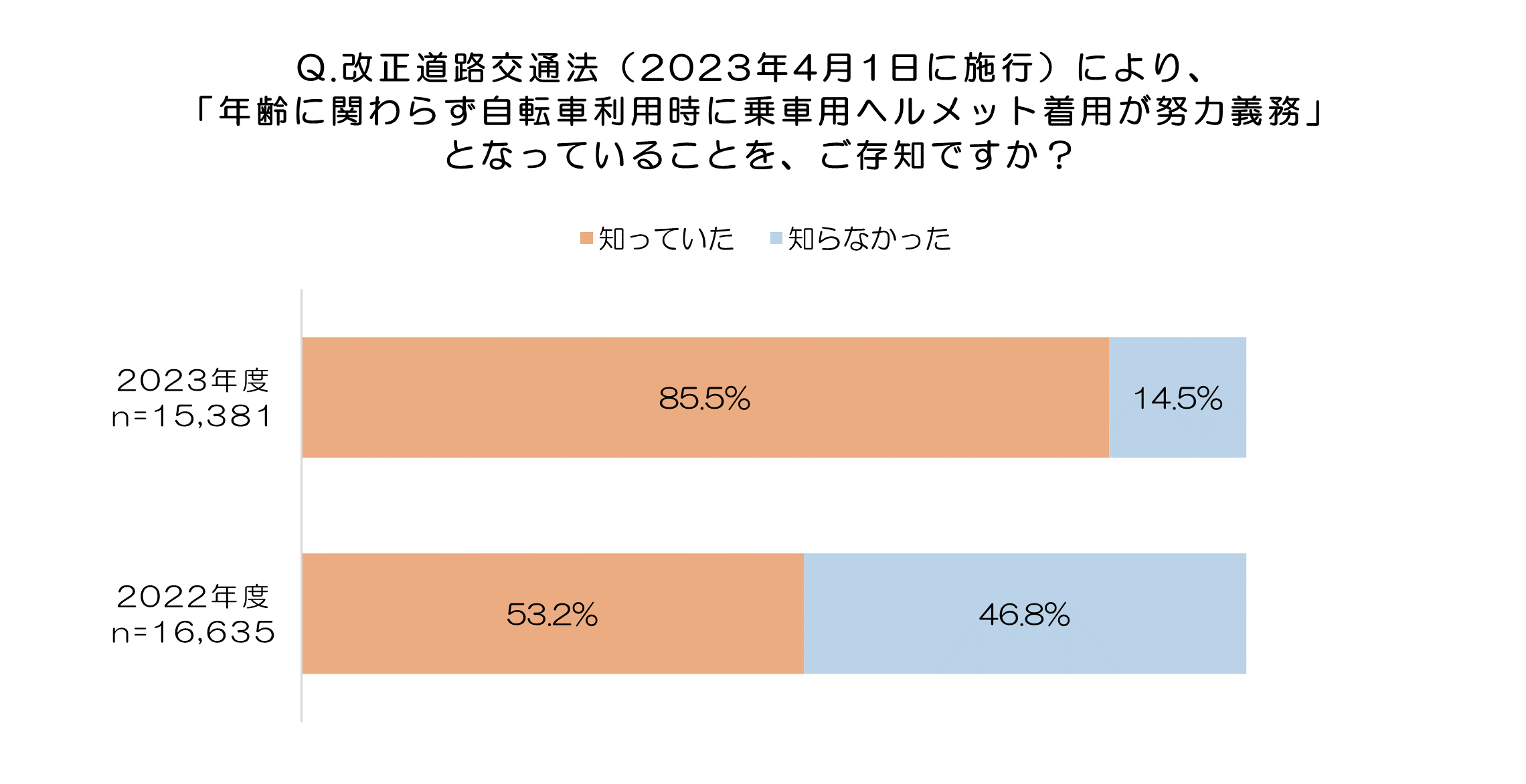 年令を問わず自転車利用時のヘルメット着用が努力義務となったことを知っているか尋ねたところ、「知っていた」と回答した方は85.5%(13,147名)で、努力義務化施行直前に実施した昨年の調査に比べ30pt以上上昇しました。
