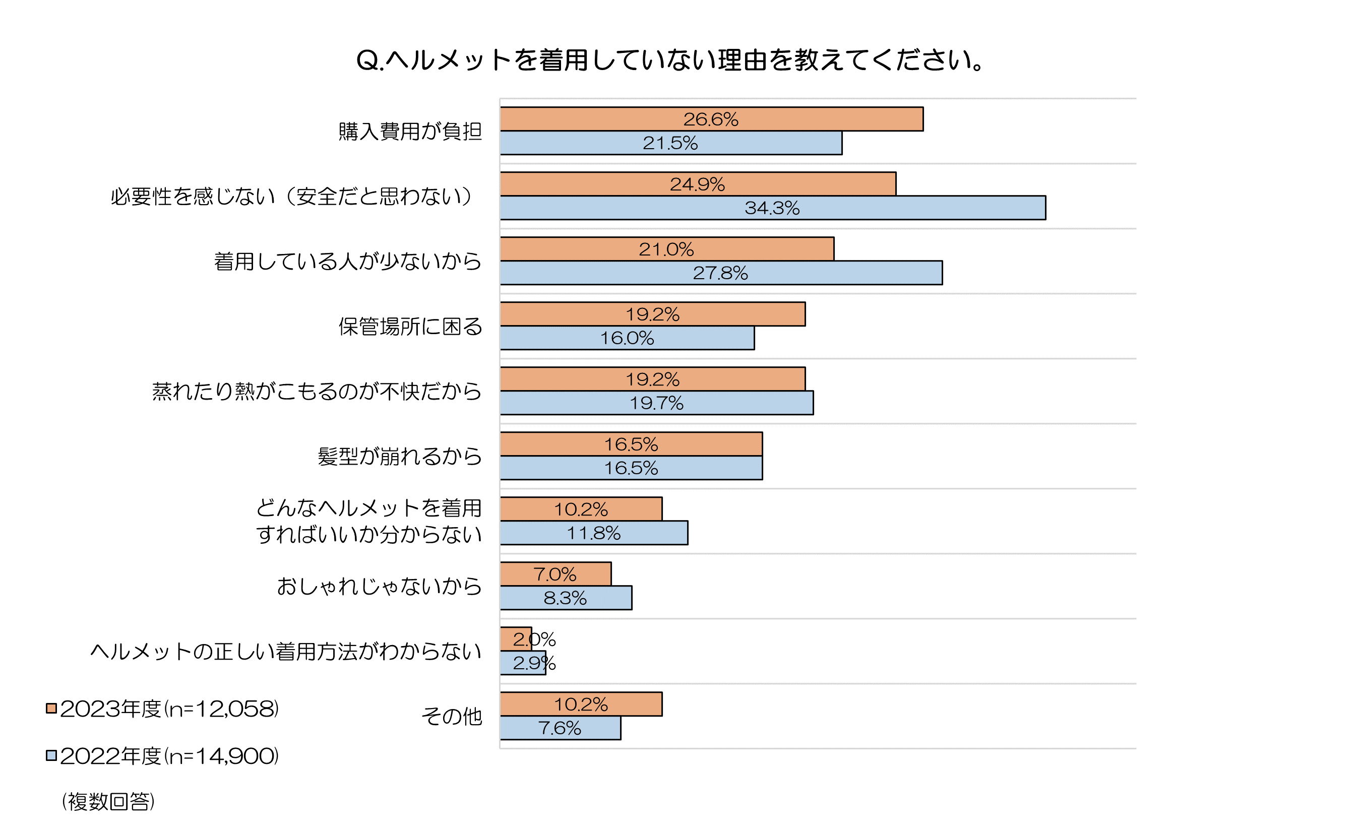 「着用していない」「ヘルメットを所有していない」と回答した方に、その理由を尋ねたところ、「購入費用が負担」と答えた人が26.6%(3,205名)と最多で、ヘルメット着用に費用がハードルとなっている一方、前年度トップの理由だった「必要性を感じない」と答えた人は24.9%と前年度比で約10pt減少しました。
