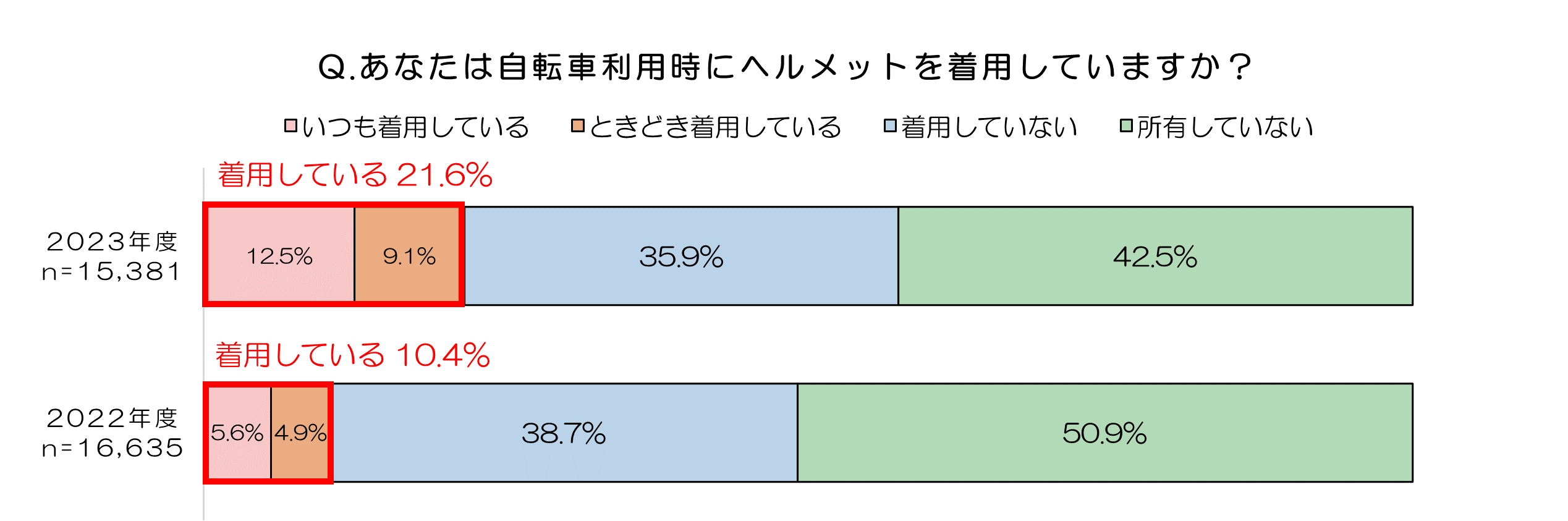 自転車利用時にヘルメットを着用しているかを尋ねたところ、「いつも着用している」と「ときどき着用している」と回答した方を合わせると21.6%となり、昨年の調査結果に比べ11.2pt上昇しましたが、約8割の方が未着用であることが判明しました。