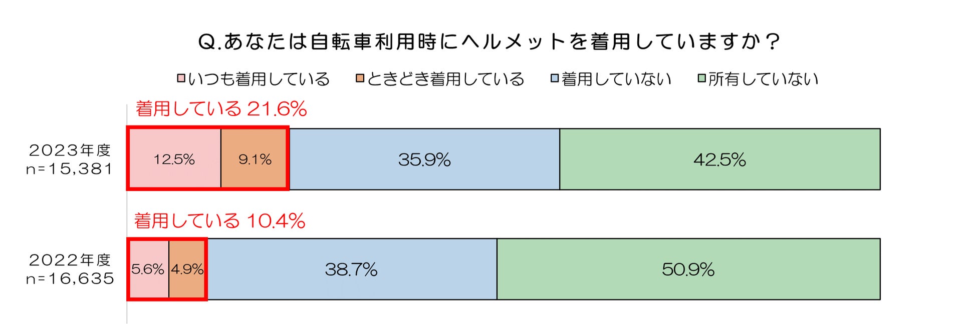 今回の調査では、自転車利用時のヘルメット着用努力義務化の認知度は85.5%と前年度比で30ptアップし、またヘルメットの着用率は21.6%という結果となり、ヘルメット着用に関し認知は進んでいるものの、まだ多くの自転車利用者がヘルメットを着用していないことがわかりました。