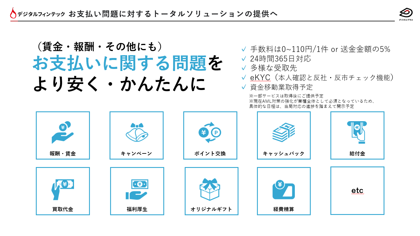 当社では、資金移動業を取得することにより、現在の提供領域に加え、報酬などの今まで対応できなかった対価性がある支払いと、犯罪収益移転防止法に準拠した送金に対応できるようになります。
