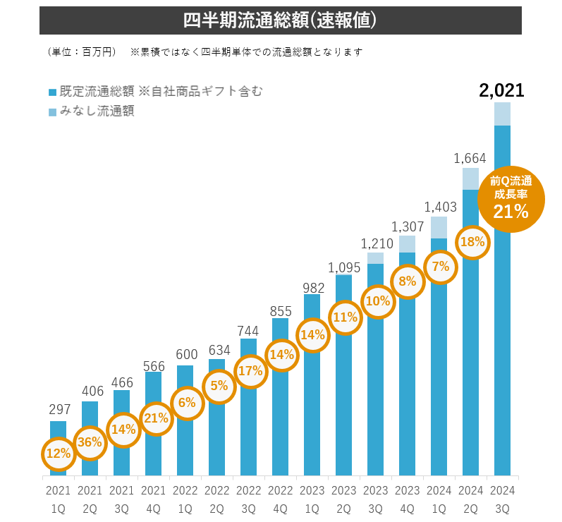 当社は、2027年9月期流通総額1,000億円の目標に向けて、資金移動業の取得、デジタル給与払いの取得に向けた動きなど、サービスとしての品質向上、また、カスタマーサクセスによるクライアント満足度向上及び営業活動の強化を推進しております。結果として、2024年9月期第3四半期において流通総額が20億円(速報値)を突破、17四半期連続成長を実現いたしました。