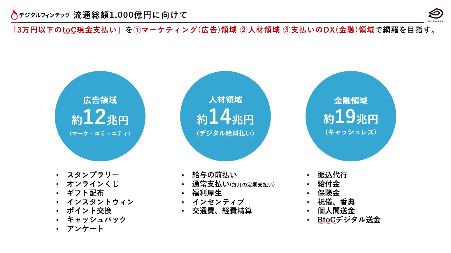 マーケティング(広告)領域・人材領域・支払いのDX(金融)領域の3つの領域を注力領域としてあげ、3万円以下のtoC向け支払いでのシェア拡大を目指し邁進しております。