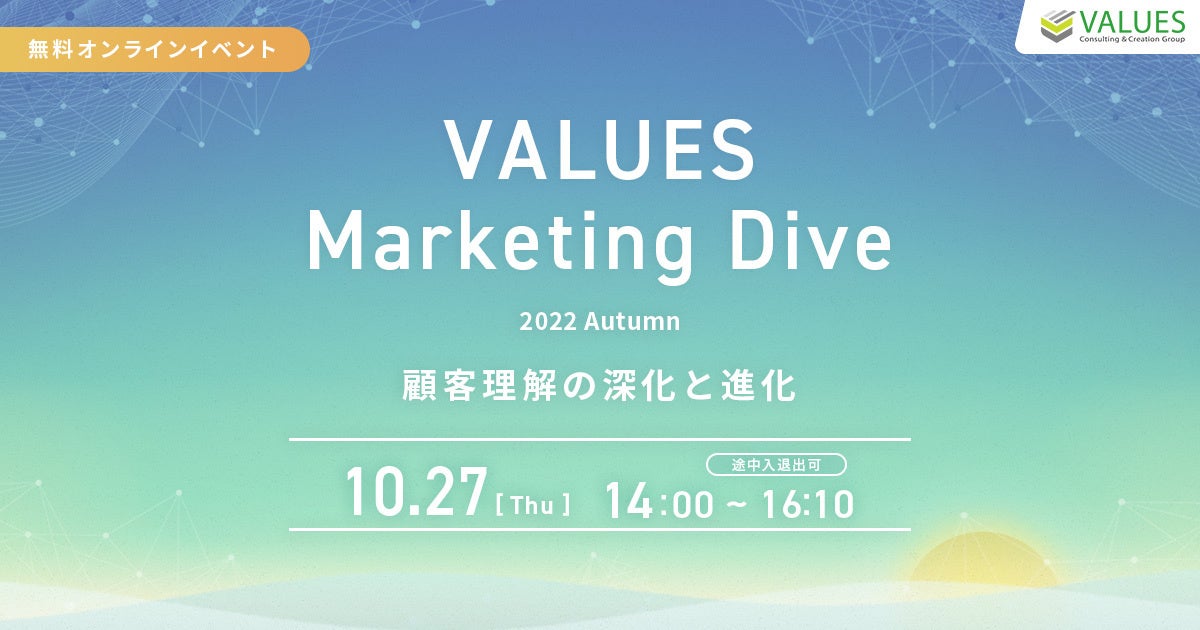 インターネット行動ログ分析によるマーケティング調査・コンサルティングサービスを提供する株式会社ヴァリューズ(本社:東京都港区、代表取締役社長:辻本 秀幸、以下「ヴァリューズ」)は、「顧客理解の深化と進化」をテーマとし、パナソニック、サイバーエージェントらがマーケティングやデータ分析の最前線を解説するカンファレンス『VALUES Marketing Dive 2022 Autumn』を、2022年10月27日(木)14:00~16:10にオンラインで無料開催いたします。