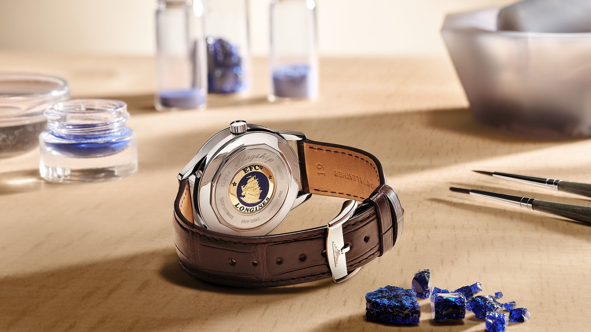 1957年に「フラッグシップ」コレクションを発表して以来、どのモデルにもケースバックに18Kゴールドのメダリオンがあしらわれ、コレクションのエンブレムである、鮮やかなブルーのエナメルの海を航海するカラベル船が描かれています。