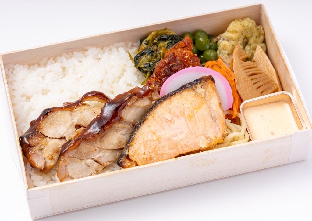 シズル感と西京味噌の香り高さで食欲をそそる様に仕上げた鮭の西京焼きと、仕上げに明治35年創業の和風香辛料メーカー「やまつ辻田」の柚子七味をかけたジューシーな鶏照り焼きのふたつをお楽しみいただける満足度の高いお弁当。ぜひ皆様にお召し上がりいただきたい逸品です。