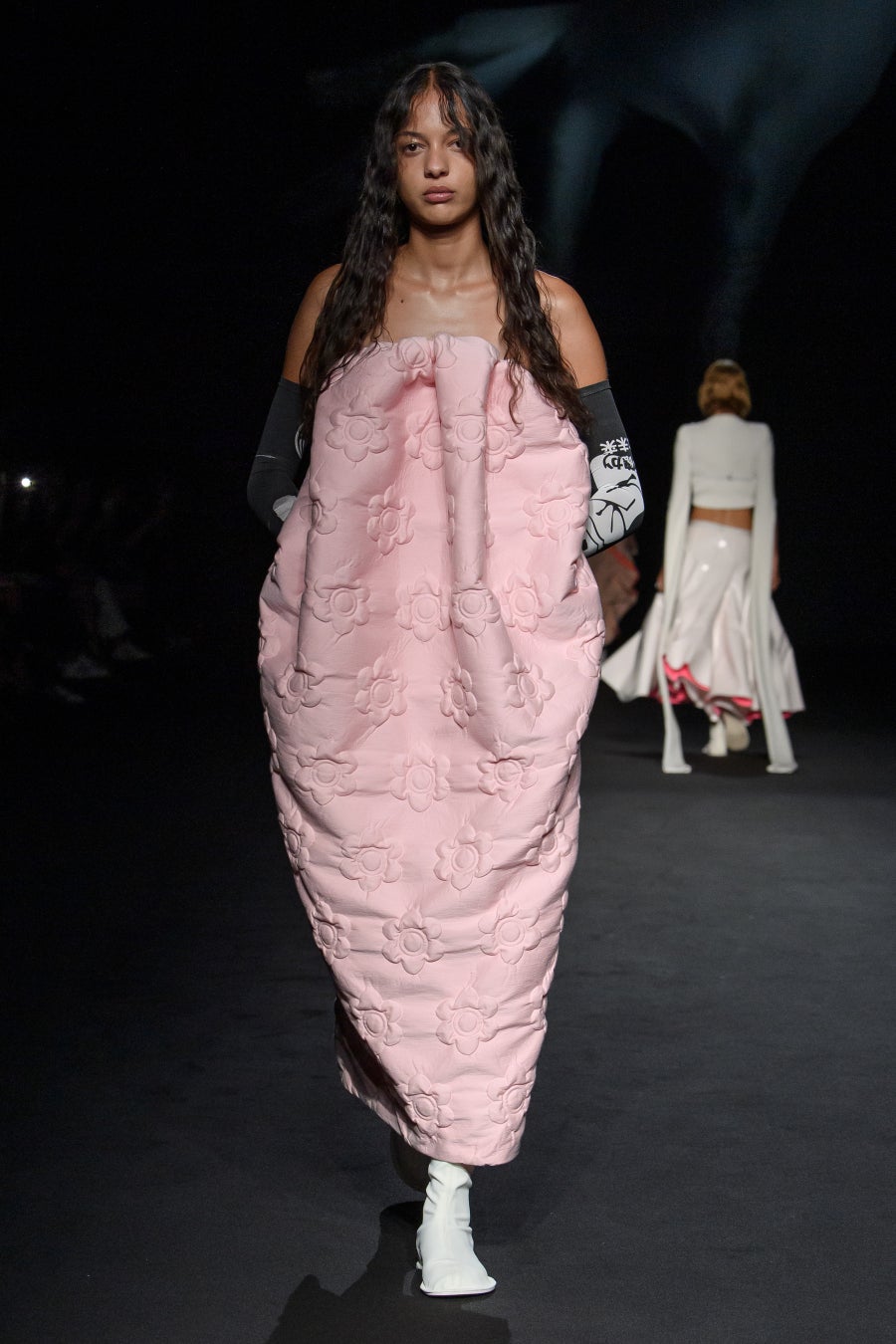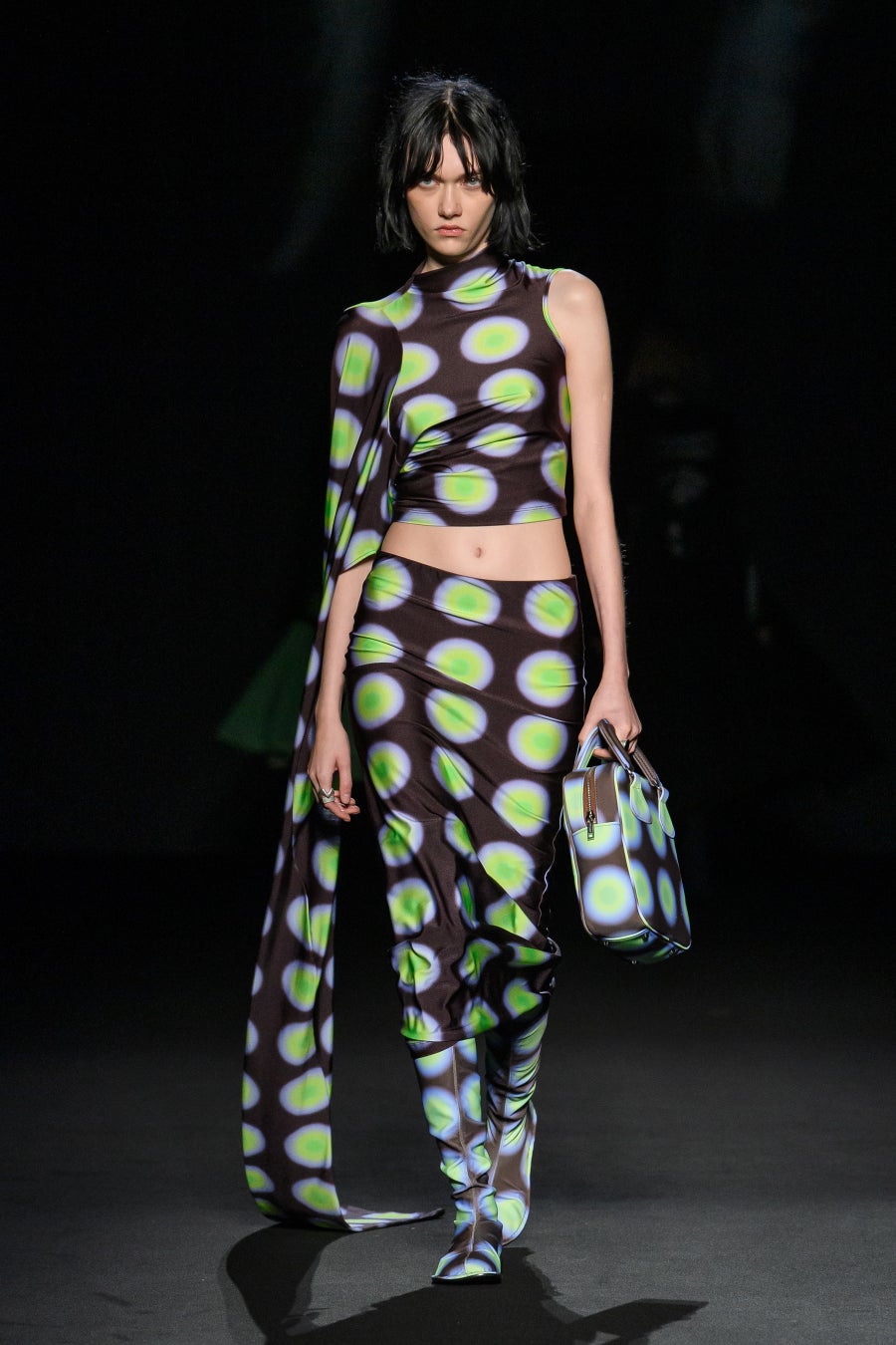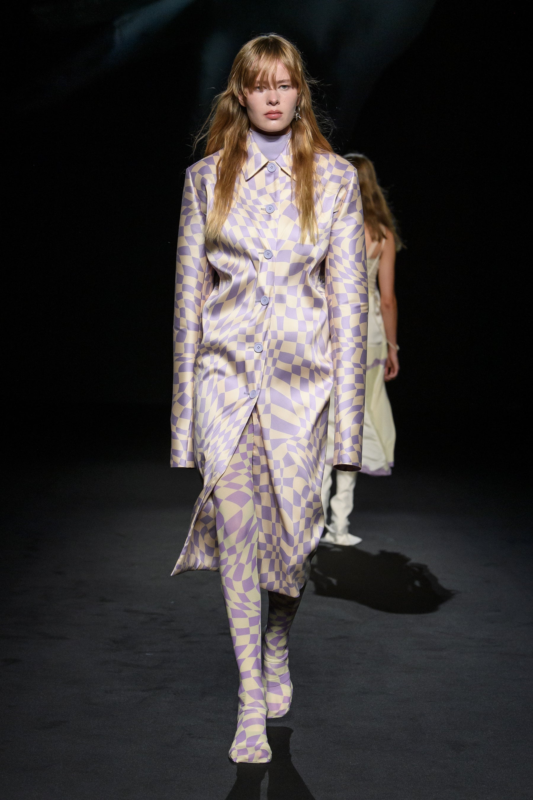 の解放を宣言するものです。図形には音があるのでしょうか?「ブーバ/キキ効果」とは、言語音と、視覚的な図形や物との関係について調べた研究結果で、1929年にドイツ人心理学者ヴォルフガング・ケーラーによって初めて報告されました。テネリフェ島で行われた最初の実験は、被験者に2つの抽象的な図形を示し、どちらが「タケテ」、どちらが「バルバ」と呼ばれているかを確認させるものでした。ほとんどの被験者は、後者の「バルバ」を丸みのある曲線的な図形、前者の「タケテ」をギザギザの図形と回答しました。2001年、ヴィラヤヌル・S・ラマチャンドランとエドワード・ハバードが、ケーラーの実験を反復しました。この実験では、アメリカの大学の学部生とインドのタミル語話者に2つの図形を示し、どちらが「ブーバ」で、どちらが「キキ」であるかを識別するよう求めました。すると、どちらの母集団でも、ほとんどの人が曲線からなる図形を「ブーバ」、ギザギザの図形を「キキ」と選び、人間の脳は確かに図形に抽象的な意味を与えているという最初の論文を支持する結果となりました。その後も図形と味覚などの感覚との関係や、脳が人間の外見をどのように認識しているかなどを調べる研究が行われました。形、色、質感、動き、音などを通した、感覚刺激に対する本能的な反応である共感覚に基づき、スポーツマックスはあらゆるロジカルな説明の枠を超え、それぞれのバランスを見出す要素をコラージュして独自の実験を行っています。シルエット、色、質感、動き、日常生活の音は、本能的に大人の成熟したレンズを通して解釈されながら、同時に子供の目の無邪気さや驚異なるものへの好奇心によってフィルターにかけられています。本コレクションはデュアリズム(Dualism)を受け入れること、異質なものと馴染みのあるものをとミックスすることを呼びかけます。大胆な創造性とCAMPのコンセプト、すなわち誇張された振る舞いや皮肉、社会規範の破壊に基づく美的スタイルや感性を謳歌するファッションの祭典なのです。コレクション全体を通して、ジオメトリックとオーガニック、自然と人工、超カジュアルと豪奢、これらの二元的エレメントの対比が常に繰り広げられます。ミニマルルックもまた、このコントラストから生まれてセカンドスキンと化しています。身体を覆う眠りを誘うような発光性のパターンは、ウルトラクロップドトップスに合わせたボリュームたっぷりのテクノクチュールスカートと交互に登場します。ストリートウェアは、イブニングウェアをアイロニカルに再解釈しています。現代のレッドカーペットに登場する裾を長く引きずるドレスを模倣したような「人生より長い」袖と裾が特徴です。アシッドトーン、パステル、ディープカラーが交互に配されたヴィヴィッドなカラーパレットの中に、オプティカルホワイトとピュアブラックのアクセントが散りばめられています。サイケデリックなモチーフのプリントやパッドのように隆起したテクスチャーによって、感覚的刺激というテーマを強調しています。アクセサリーは、成型されたセカンドスキンブーツに代表されるフットウェアやアンチストレスのバッグが中心となっています。さまざまな時代をインスピレーションソースとするシェイプは分解と再構築を繰り返し、過去のドレスコードを二極化しています。1950年代のAライン、ローウエスト、ナローショルダー、ラージフレアシルエットは、60年代の未来的なスペースエイジスタイル、さらにテクノミュージックやレイブシーンからサイバーパンクスタイルが生まれた90年代のカウンターカルチャールックと並置されます。すなわちこのコレクションは、シュガーパンク、サイコシック、テクノクチュールの世界を行き来する、絶え間ない実験へと変貌を遂げています。他者を肯定し、型にはまることに抵抗しながら互いに混ざり合い、極限を絶え間なく追求し続けるのです。