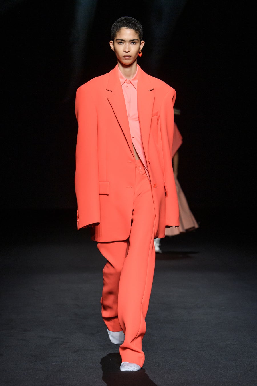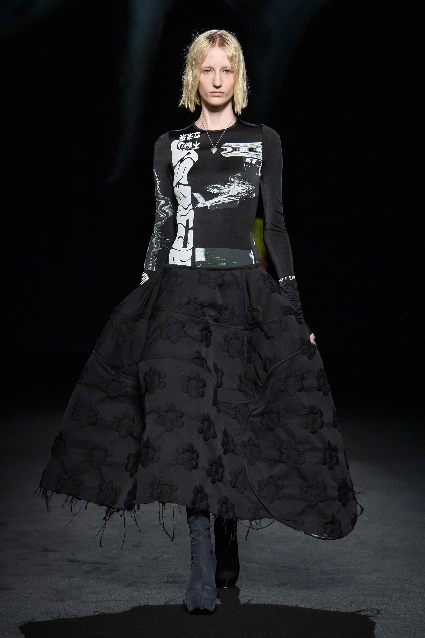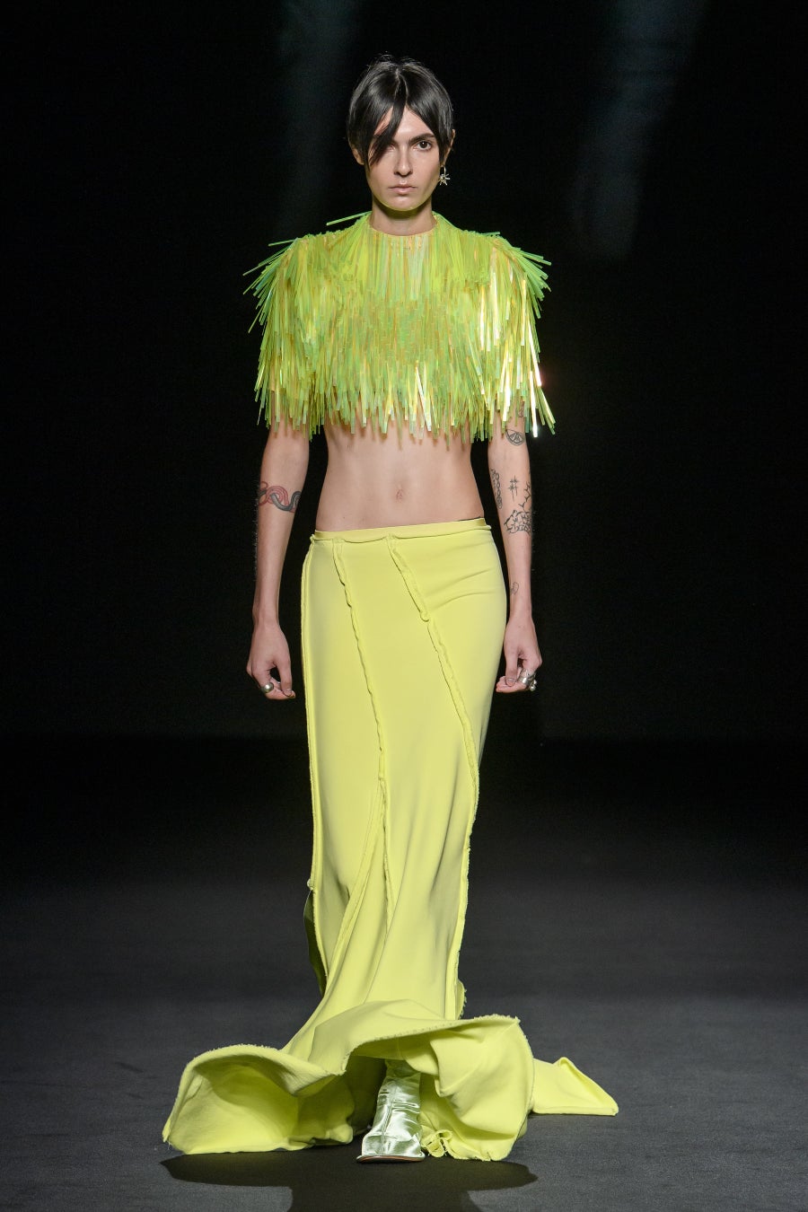 の解放を宣言するものです。図形には音があるのでしょうか?「ブーバ/キキ効果」とは、言語音と、視覚的な図形や物との関係について調べた研究結果で、1929年にドイツ人心理学者ヴォルフガング・ケーラーによって初めて報告されました。テネリフェ島で行われた最初の実験は、被験者に2つの抽象的な図形を示し、どちらが「タケテ」、どちらが「バルバ」と呼ばれているかを確認させるものでした。ほとんどの被験者は、後者の「バルバ」を丸みのある曲線的な図形、前者の「タケテ」をギザギザの図形と回答しました。2001年、ヴィラヤヌル・S・ラマチャンドランとエドワード・ハバードが、ケーラーの実験を反復しました。この実験では、アメリカの大学の学部生とインドのタミル語話者に2つの図形を示し、どちらが「ブーバ」で、どちらが「キキ」であるかを識別するよう求めました。すると、どちらの母集団でも、ほとんどの人が曲線からなる図形を「ブーバ」、ギザギザの図形を「キキ」と選び、人間の脳は確かに図形に抽象的な意味を与えているという最初の論文を支持する結果となりました。その後も図形と味覚などの感覚との関係や、脳が人間の外見をどのように認識しているかなどを調べる研究が行われました。形、色、質感、動き、音などを通した、感覚刺激に対する本能的な反応である共感覚に基づき、スポーツマックスはあらゆるロジカルな説明の枠を超え、それぞれのバランスを見出す要素をコラージュして独自の実験を行っています。シルエット、色、質感、動き、日常生活の音は、本能的に大人の成熟したレンズを通して解釈されながら、同時に子供の目の無邪気さや驚異なるものへの好奇心によってフィルターにかけられています。本コレクションはデュアリズム(Dualism)を受け入れること、異質なものと馴染みのあるものをとミックスすることを呼びかけます。大胆な創造性とCAMPのコンセプト、すなわち誇張された振る舞いや皮肉、社会規範の破壊に基づく美的スタイルや感性を謳歌するファッションの祭典なのです。コレクション全体を通して、ジオメトリックとオーガニック、自然と人工、超カジュアルと豪奢、これらの二元的エレメントの対比が常に繰り広げられます。ミニマルルックもまた、このコントラストから生まれてセカンドスキンと化しています。身体を覆う眠りを誘うような発光性のパターンは、ウルトラクロップドトップスに合わせたボリュームたっぷりのテクノクチュールスカートと交互に登場します。ストリートウェアは、イブニングウェアをアイロニカルに再解釈しています。現代のレッドカーペットに登場する裾を長く引きずるドレスを模倣したような「人生より長い」袖と裾が特徴です。アシッドトーン、パステル、ディープカラーが交互に配されたヴィヴィッドなカラーパレットの中に、オプティカルホワイトとピュアブラックのアクセントが散りばめられています。サイケデリックなモチーフのプリントやパッドのように隆起したテクスチャーによって、感覚的刺激というテーマを強調しています。アクセサリーは、成型されたセカンドスキンブーツに代表されるフットウェアやアンチストレスのバッグが中心となっています。さまざまな時代をインスピレーションソースとするシェイプは分解と再構築を繰り返し、過去のドレスコードを二極化しています。1950年代のAライン、ローウエスト、ナローショルダー、ラージフレアシルエットは、60年代の未来的なスペースエイジスタイル、さらにテクノミュージックやレイブシーンからサイバーパンクスタイルが生まれた90年代のカウンターカルチャールックと並置されます。すなわちこのコレクションは、シュガーパンク、サイコシック、テクノクチュールの世界を行き来する、絶え間ない実験へと変貌を遂げています。他者を肯定し、型にはまることに抵抗しながら互いに混ざり合い、極限を絶え間なく追求し続けるのです。