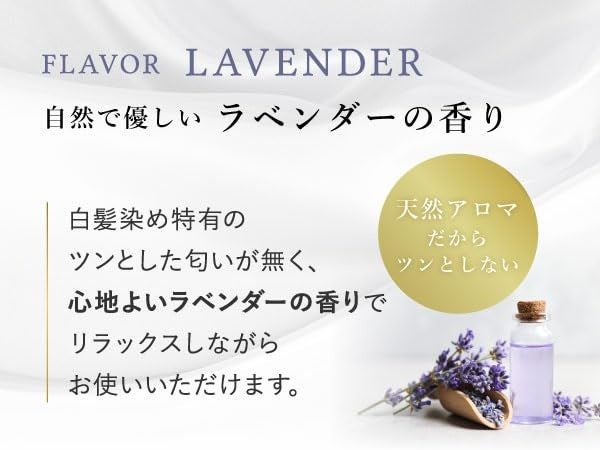 白髪染め特有のツンとした匂いが無く、心地良いラベンダーの香りでリラックスしながらお使いいただけます。