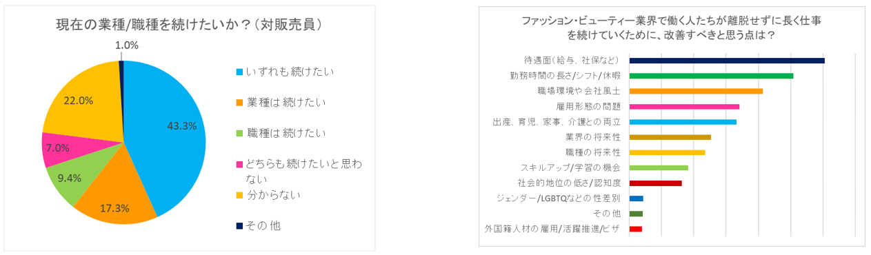 また、業界での就業意欲に加え、販売職に限定した調査結果についても、販売職として働き続けたいとする人が多い一方、ライフステージの変化への対応や待遇改善については、長く働き続けるための改善ポイントとして挙げる人も多く見られました。