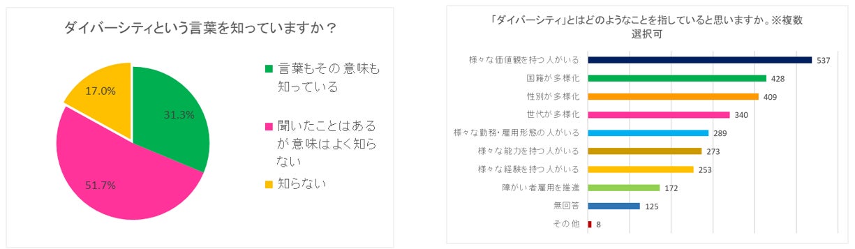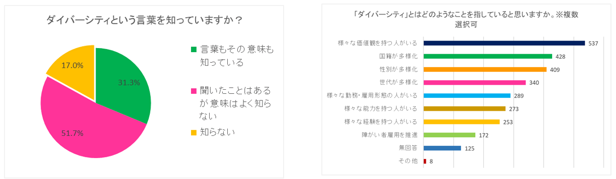 - 「ダイバーシティ」という言葉の認知度は80%超である一方、意味の認知度は30%程度にとどまった
