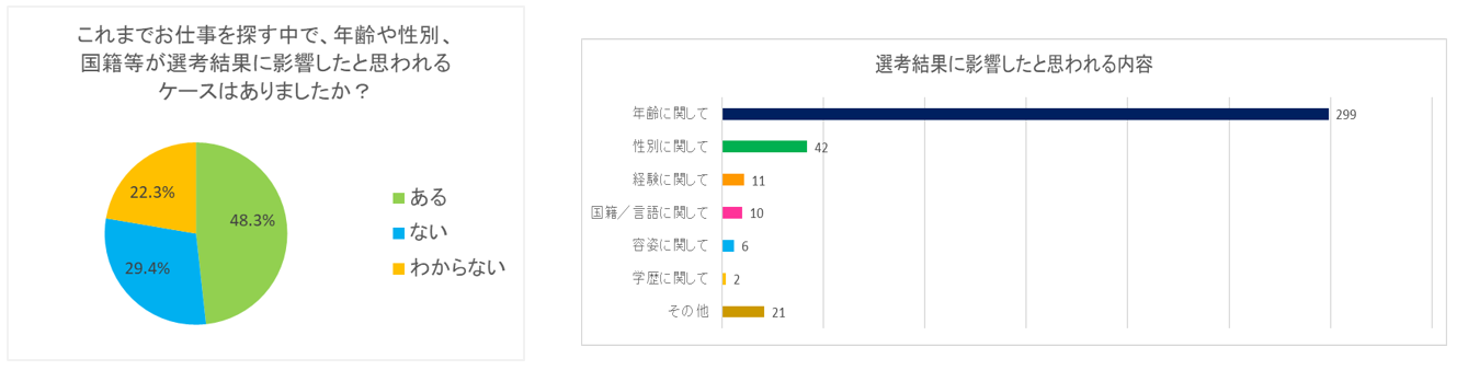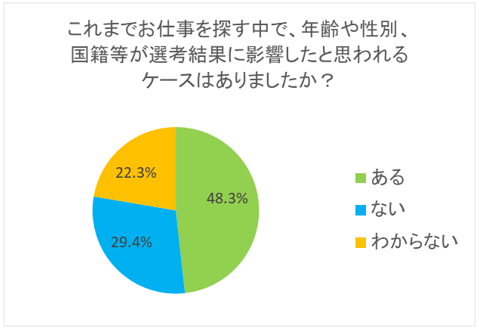 - 一方、これまでの就職選考時、年齢や性別、国籍などが選考結果に影響した、と認識する人は半数以上