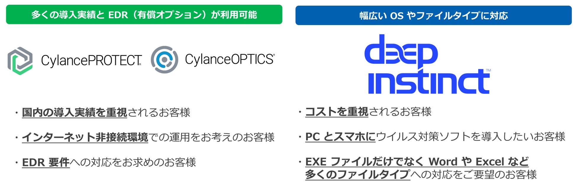 “LANSCOPE サイバープロテクション”は、AIを活用したアンチウイルスで、既知のマルウェアはもちろん、未知・亜種のマルウェアからもデバイスを防御します。高性能な AI アンチウイルス「CylancePROTECT」や「Deep Instinct」をMOTEXのマネージドサービスとして提供します。この2種類のウイルス対策ソフト(アンチウイルス)は、お客様の環境や用途に応じて選択いただけます。