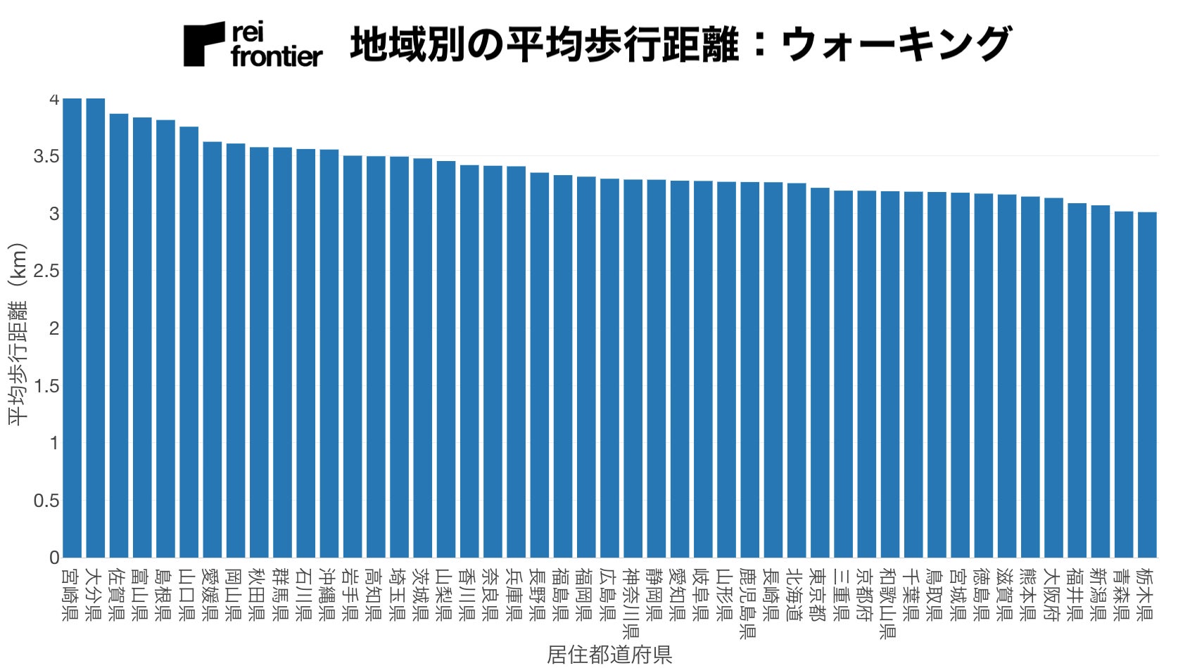 ウォーキング:宮崎県、鳥取県、佐賀県の 3 県が 50 分を超えている