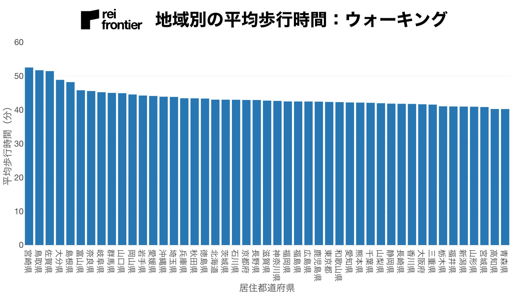 ウォーキングに費やしている時間は、宮崎県、鳥取県、佐賀県の 3 県が 50 分を超えています。