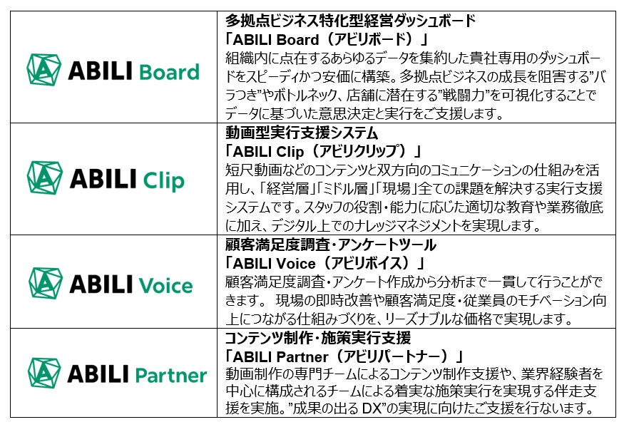 事業内容 :多拠点ビジネスの潜在力を引き出す「ABILI」の開発・運営、及び経営コンサルティング