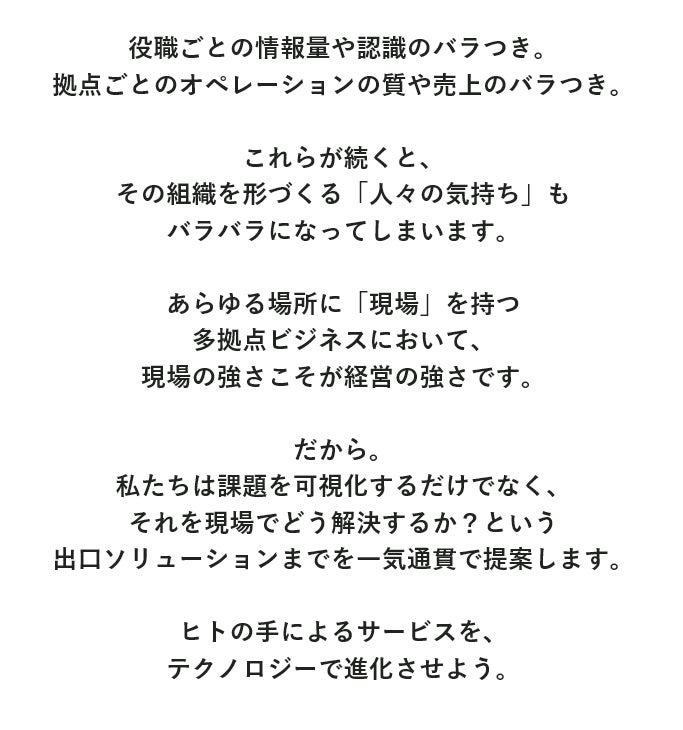 多拠点ビジネス特有の”バラつき”を改善し、提供価値と利益の最大化を推進、「可視化→実行プラットフォーム」をワンストップで実現