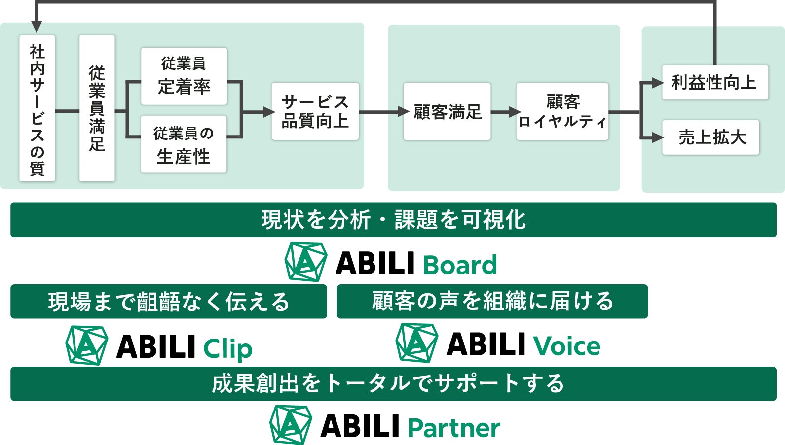 ABILIはハーバード大学教授ヘスケット氏とサッサー氏らがしたサービス業の持続的成長のフレームワークとされれる「サービス・プロフィット・チェーン(以下、SPC)」に沿った価値提供を行います。企業の長期利益は従業員満足(ES)、顧客満足(CS)が基となり、ロイヤルカスタマーを生み出すことで持続的成長につながることが知られています。