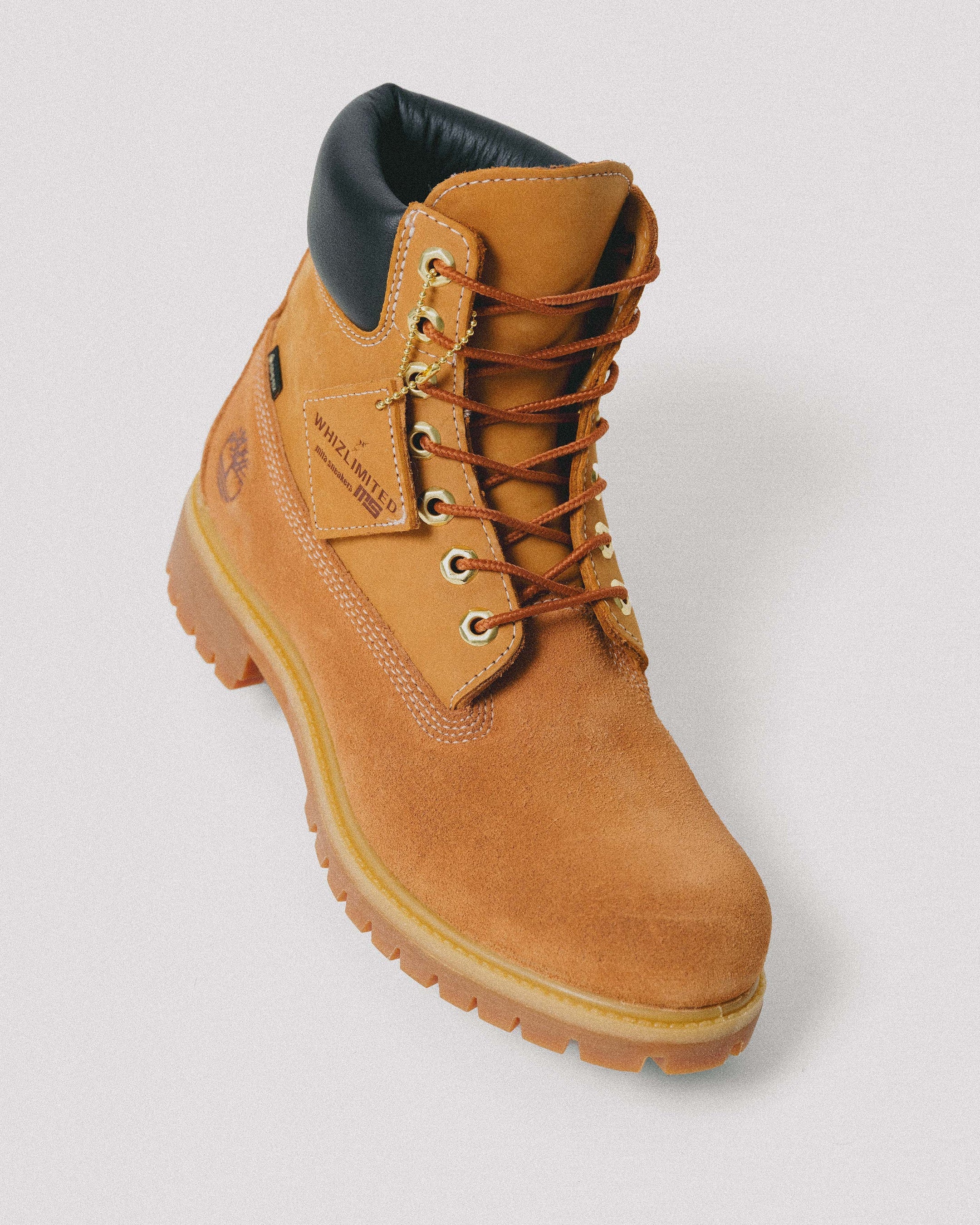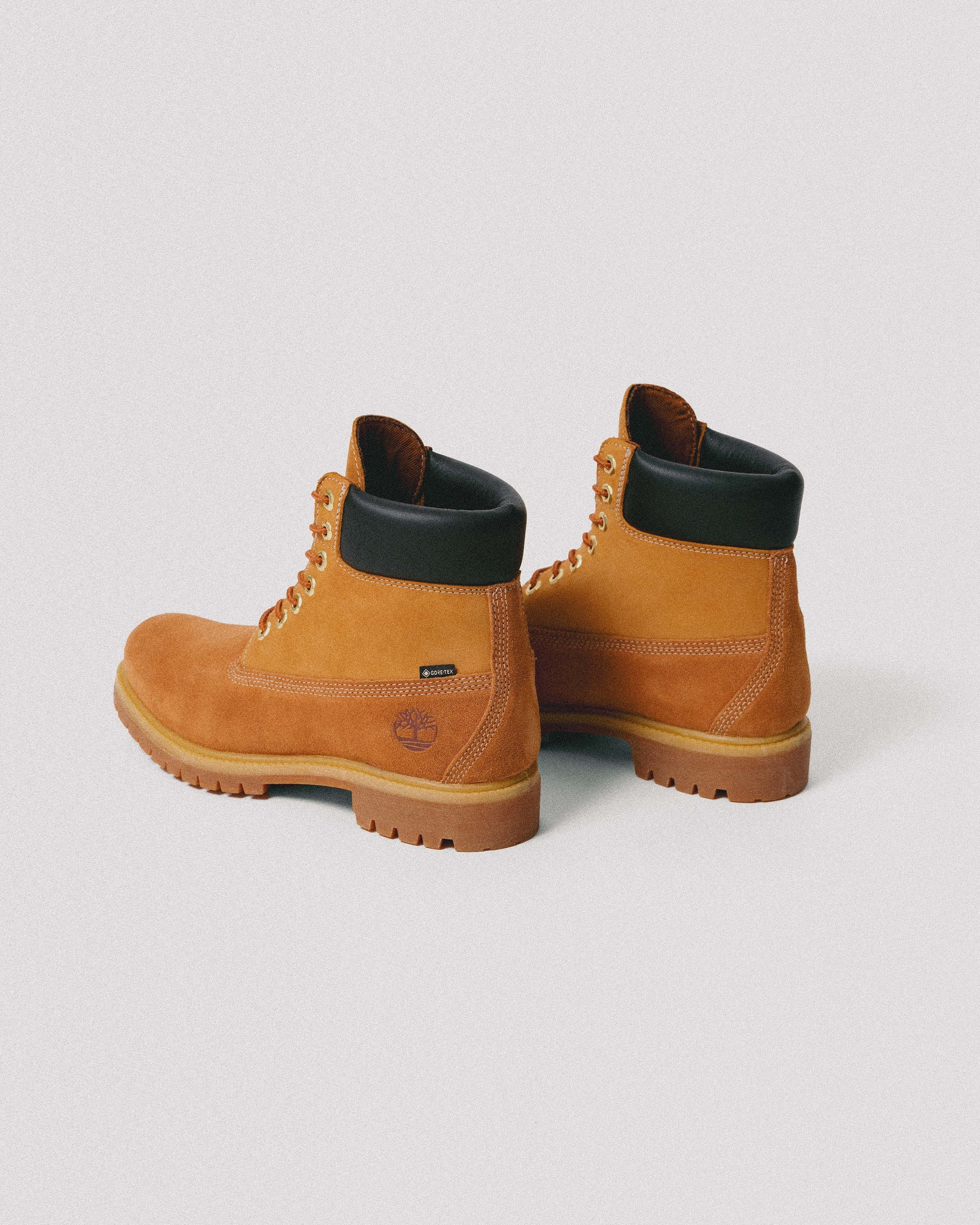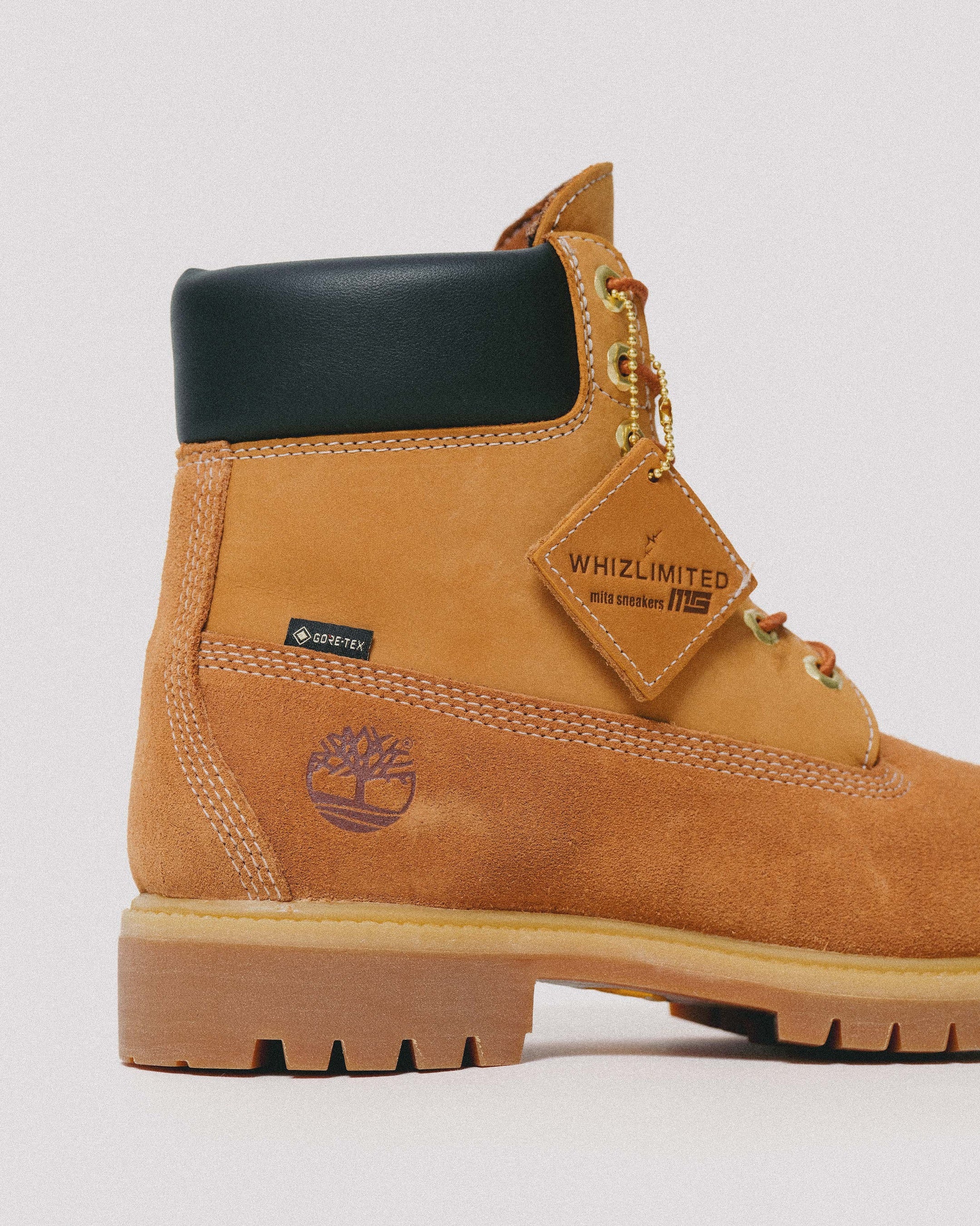 初の『ミタスニーカーズ』との別注になった今作は、「イエローブーツ」のオリジナルのシルエットやアイコニックな4ステッチはそのままに、アッパーの素材やソールをアップデートいたしました。アッパーは、上層部分にイエローのヌバックレザーを使用しながら、下層部分には同色のスエードを用いることで、濃淡の異なる素材感と色味による奥行き感を演出。さらに、防水透湿の機能素材「ゴアテックス(GORE-TEX)」を全体に搭載し、それを証明するブラックのピスネームを素材の切り返し部分にさりげなくあしらっているほか、ソールはグリップ性に優れたイタリアのビブラム(VIBRAM)社製のアウトソールを採用しているため、これからの季節に活躍するであろうアイテムに仕上がっています。そして、表側には「ティンバーランド」のロゴが、裏側には『ミタスニーカーズ』と「ウィズリミテッド」のロゴが型押しされたトリプル別注を示す限定のハングタグを制作いたしました。