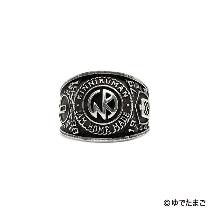 チャンピオンリングは、KIN マークをセンターに、「肉」ロゴおよび JAM HOME MADE のブランドロゴと、それぞれの誕生年を月桂樹の装飾とともにサイドパネルに配しました。毎日でも使いやすいよう、指になじむ厚さに調整しています。